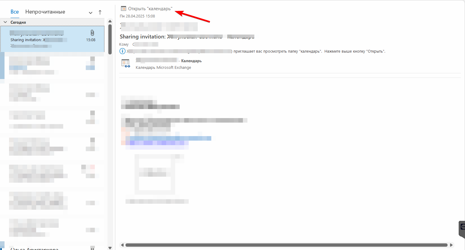 5. На почту сотрудника, которому нужно было дать досутп к календарю, придет письмо, в нем нужно нажать "открыть календарь".